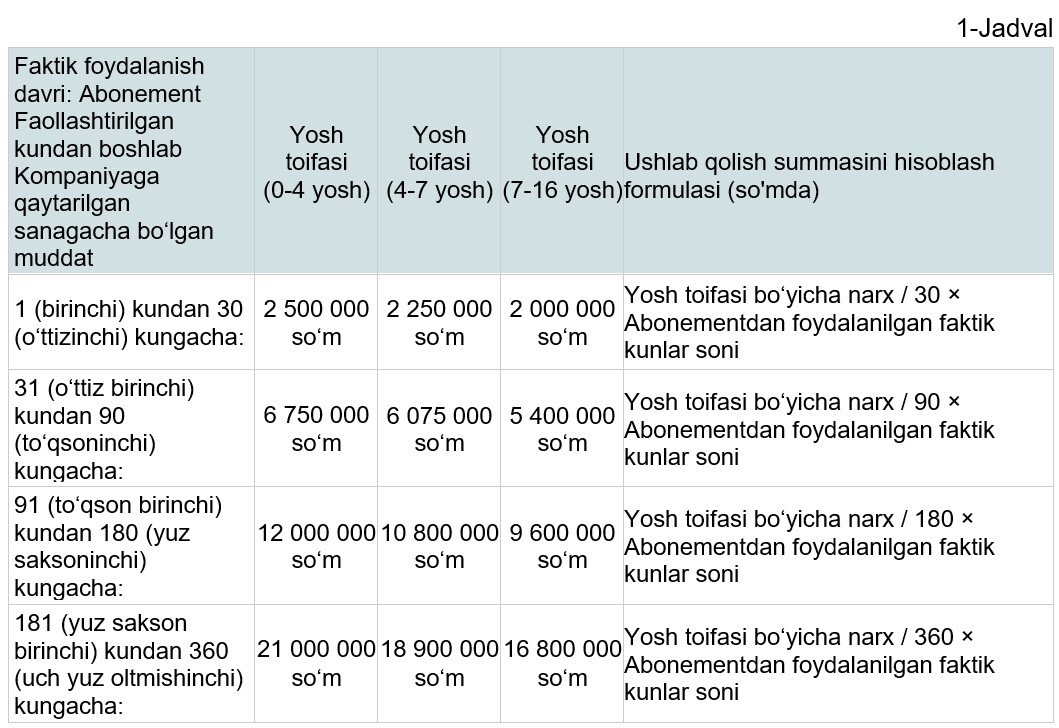 5.5. Abonement faollashtirilgan taqdirda, Mijoz uni Kompaniyaga qaytarish va Abonementning qoldiq qiymatini qaytarishni talab qilish huquqiga ega. Abonementning qoldiq qiymati, 1-Jadvalga muvofiq hisoblangan ushlab qolish summasi chegirilgan holda aniqlanadi.