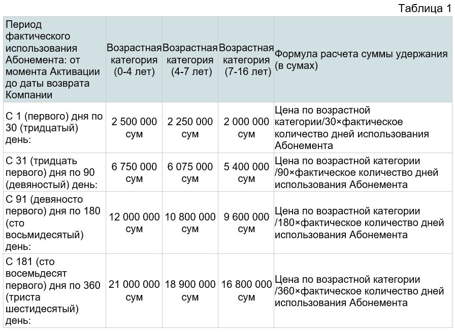 4.2.12. Har bir bola uchun Abonementni alohida sotib olish. Mijoz bir nechta bolalar uchun bitta Abonementdan foydalanganligi aniqlagan taqdirda, Kompaniya bunday Abonementni bekor qilishga haqli ekanligi to'g'risida tanishtirilgan va rozi bo'lgan;